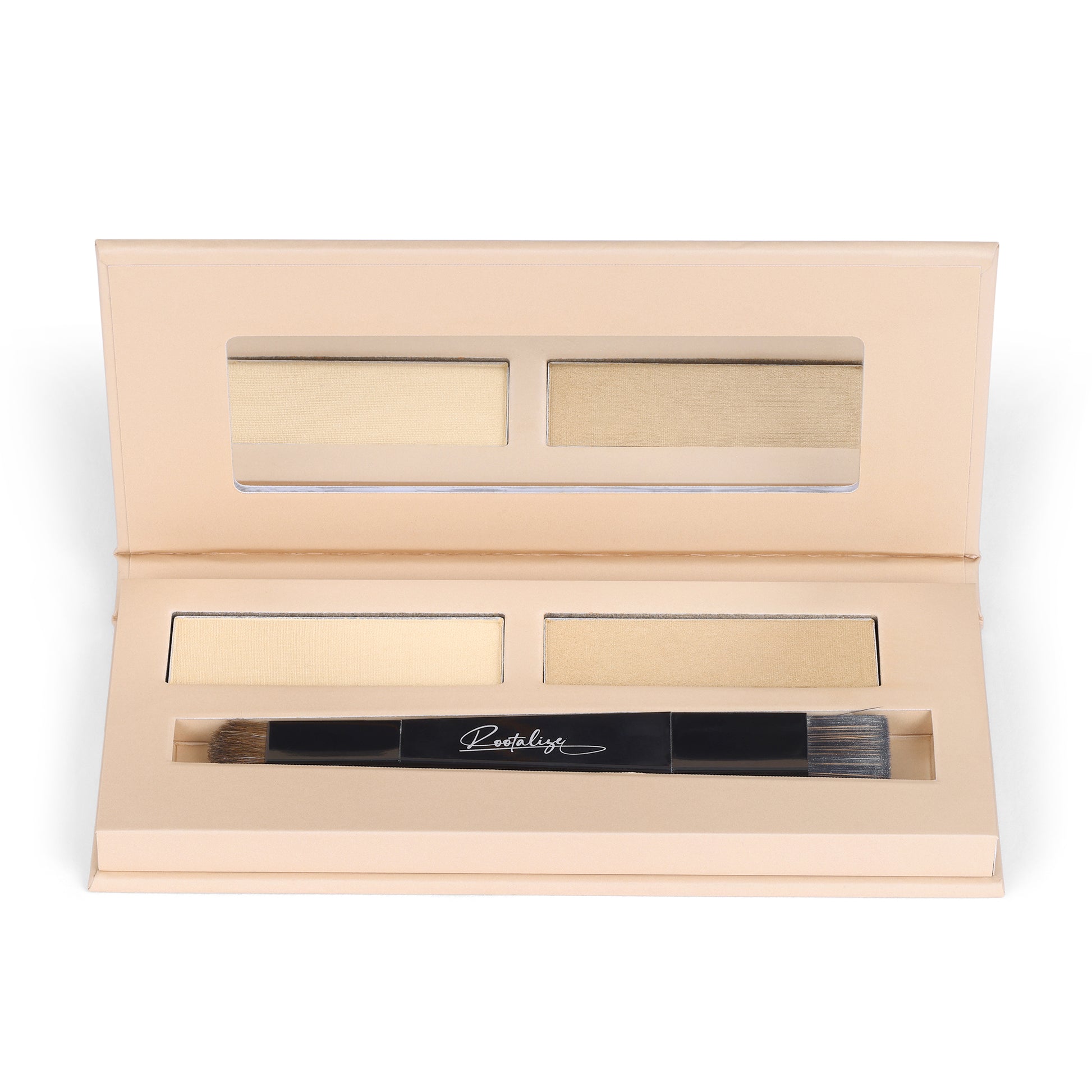 - Using the 2-headed brush, apply the darker powder directly to your roots, pressing firmly from the scalp outward. Avoid wide, sweeping motions.
